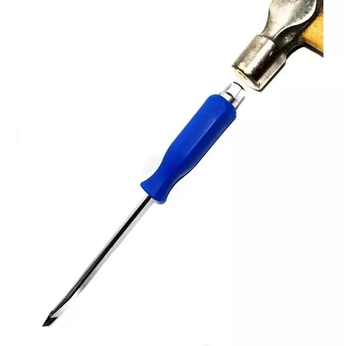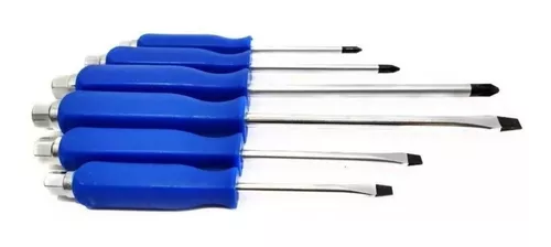 - Juego de 6 destornilladores de impacto, ideales para trabajos difíciles que requieran de una fuerza extra debido a que se puede colocar una llave para dar mas fuerza o golpear en el extremo superior de ser necesario.