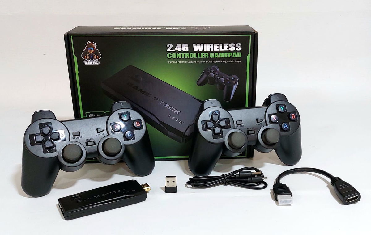 Controles: Incluye dos joysticks inalámbricos (similares a los de PS2/PS1) que se conectan a la consola mediante un receptor USB de 2.4 GHz. Requieren pilas AAA (no incluidas).