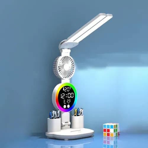 Esta lámpara de escritorio LED está diseñada con múltiples funciones que incluyen un portalápices, un soporte para teléfono con una pantalla de reloj LED con luz ambiental y una salida de carga USB.