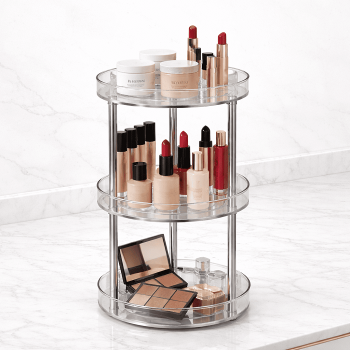 Organizador giratorio3 nivelesMedidas 24,5 cm x 35,5cmMaterial: Acrílico y Acero